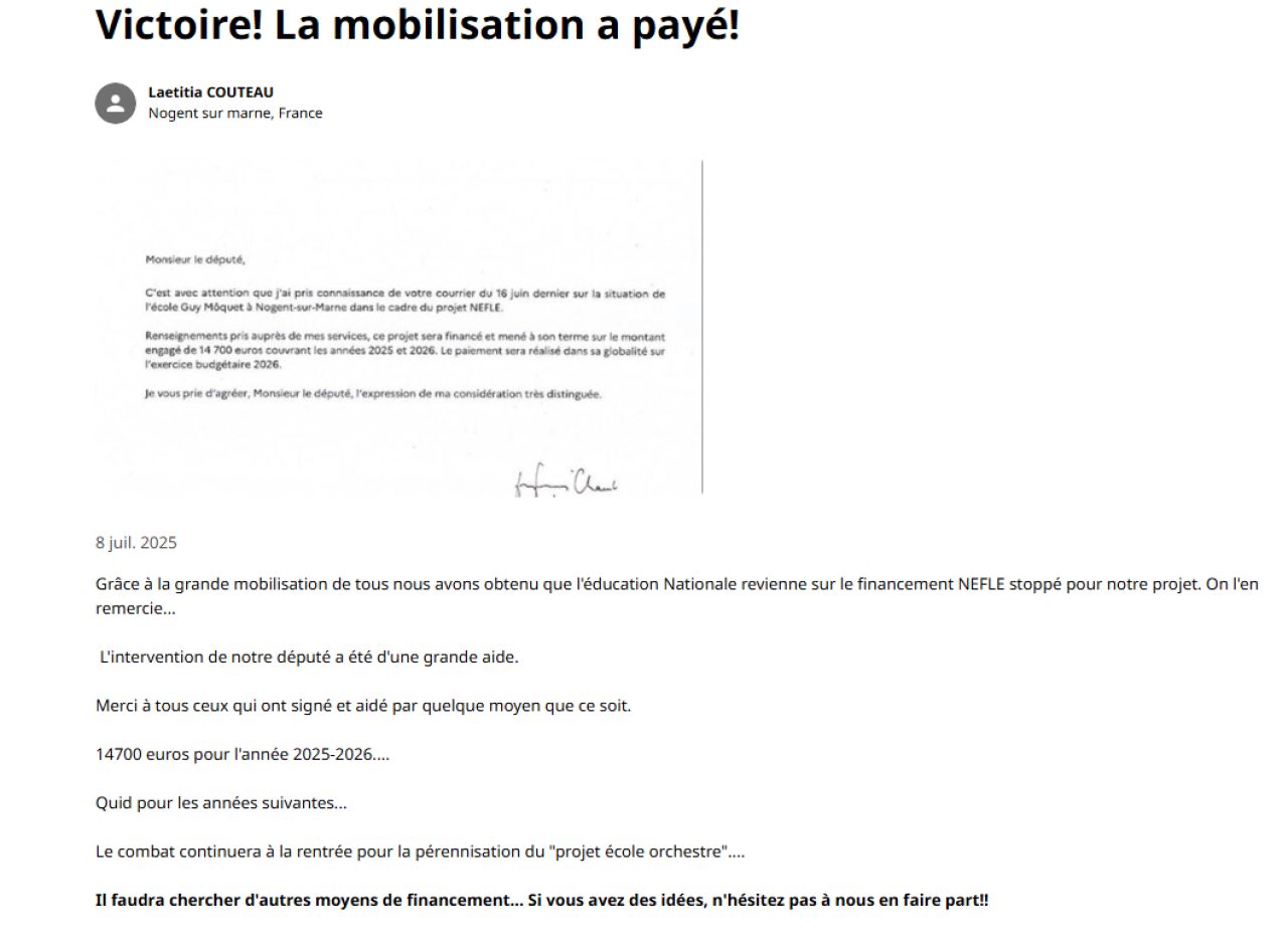 Mais la mobilisation doit continuer afin de pérenniser notre projet "école orchestre".